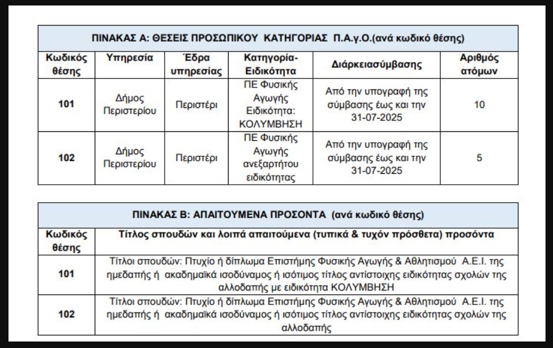15 Προσλήψεις θα γίνουν στον Δήμο Περιστερίου με οκτάμηνες συμβάσεις εργασίας ιδιωτικού δικαίου ορισμένου χρόνου (ΑΣΕΠ ΣΟΧ).