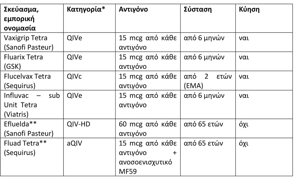 *aQIV: Τετραδύναμο αδρανοποιημένο εμβόλιο γρίπης με ανοσοενισχυτικό MF59, QIV-HD: Τετραδύναμο αδρανοποιημένο εμβόλιο υψηλής δόσης, QIVe: Τετραδύναμο αδρανοποιημένο συμβατικό εμβόλιο παρασκευαζόμενο με επώαση σε ωά ορνίθων, QIVc: Τετραδύναμο αδρανοποιημένο εμβόλιο παρασκευαζόμενο σε κυτταροκαλλιέργειες, EMA: European Medicines Agency
