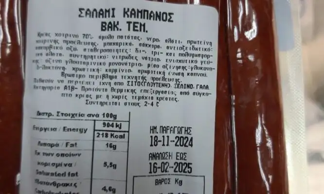 Συγκεκριμένα, πρόκειται για το προϊόν ΣΑΛΑΜΙ ΚΑΜΠΑΝΟΣ «ΑΛΚΗΣ» συσκευασίας 0,345 gr, με ημερομηνία ανάλωσης έως 16-02-2025.
