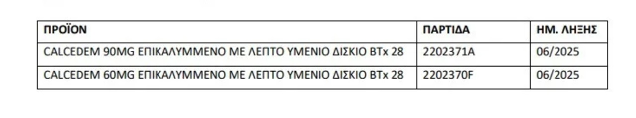 Ο ΕΟΦ με ανακοίνωση του, γνωστοποιεί την ανάκληση παρτίδων του του φαρμακευτικού προϊόντος CALCEDEM 90MG επικαλυμμένο με λεπτό υμένιο δισκίο ΒΤx 28 και CALCEDEM 60MG επικαλυμμένο με λεπτό υμένιο δισκίο ΒΤx 28, λόγω αποτελεσμάτων εκτός προδιαγραφών κατά τον έλεγχο Νιτροζαμινών στο πλαίσιο ελέγχων σταθερότητας.