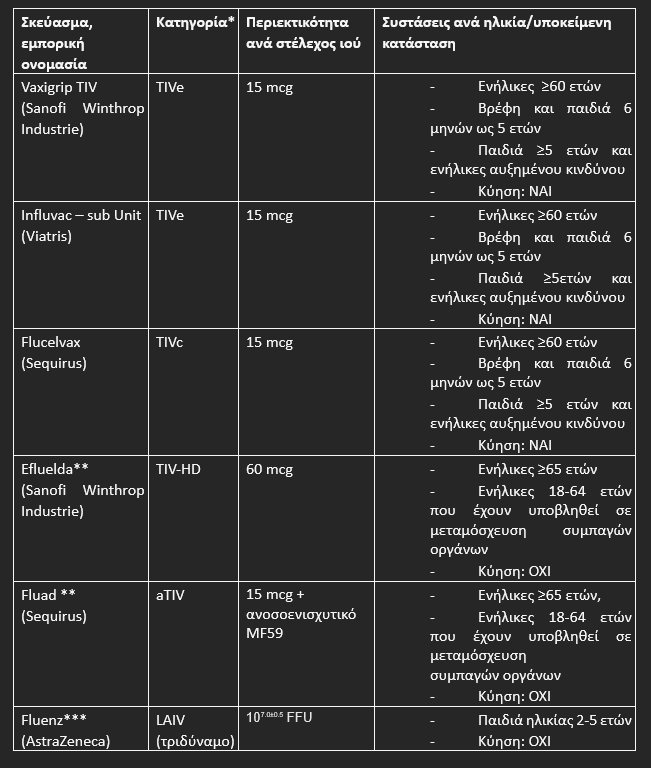 Τα συνιστώμενα από την Εθνική Επιτροπή Εμβολιασμών αντιγριπικά εμβόλια για την περίοδο 2025-2026 είναι τα παρακάτω: