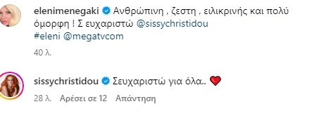 Η Σίσσυ Χρηστίδου έσπευσε να απαντήσει στην ανάρτηση της Ελένης Μενεγάκη γράφοντας: «Σευχαριστώ για όλα.. ».