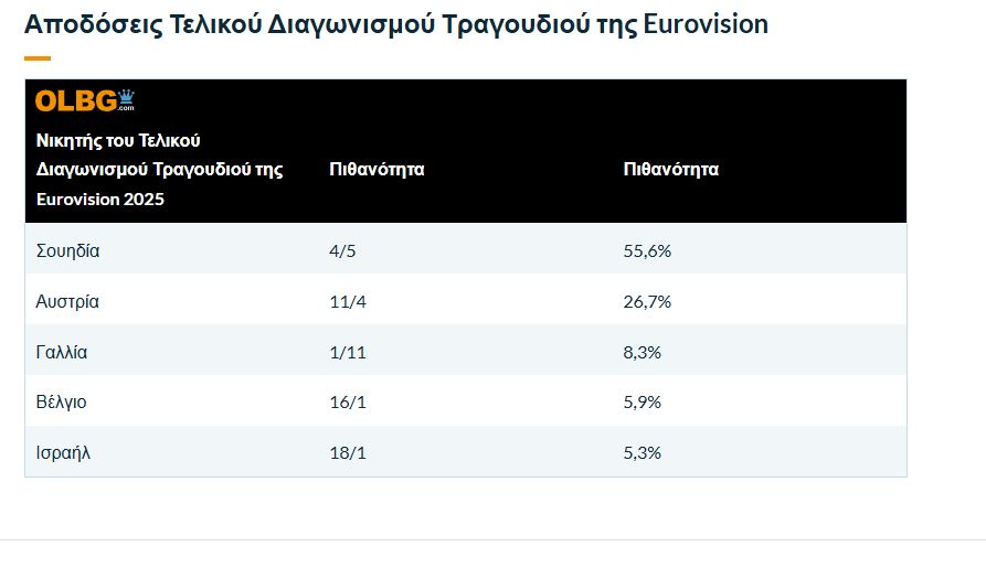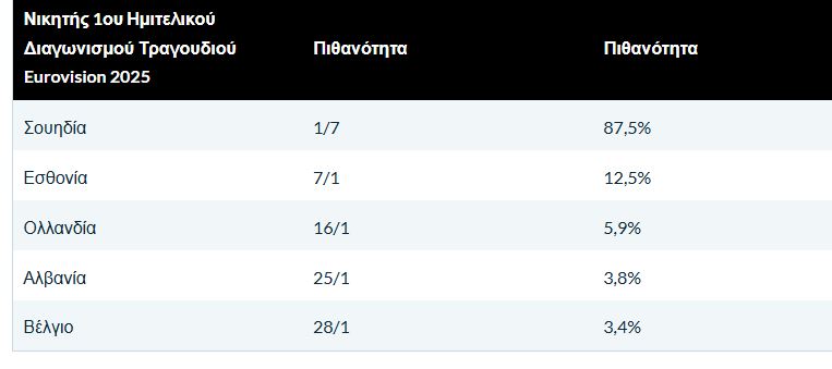 Η Σουηδία είναι το μεγάλο φαβορί για την κατάκτηση της πρώτης θέσης στον 1ο Ημιτελικό του Διαγωνισμού Τραγουδιού της Eurovision 2025 με απόδοση 1/7.