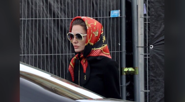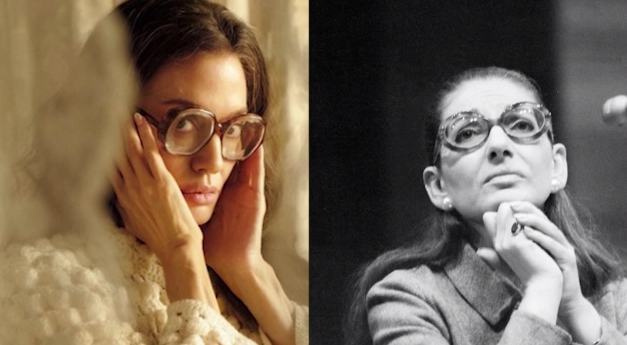 Η Αντζελίνα Τζολί που ενσαρκώνει την κορυφαία Ελληνίδα υψίφωνο φορά μεταξωτό μαντήλι στα μαλλιά και μεγάλα κοκάλινα γυαλιά.