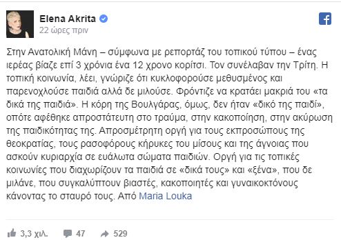 Στην υπόθεση του ιερέα από τη Μάνη που κακοποιούσε σεξουαλικά 12χρονη, επί τρία χρόνια, και κυρίως για την κοινωνία που ενώ ήξερε σιωπούσε αναφέρθηκε η Έλενα Ακρίτα.