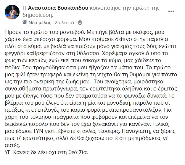 Για χάρη του τόλμησα πράγματα που φοβόμουν και επέμεινα να τον διεκδικώ παρόλο που δεν τον έχω ξανακάνει για κανέναν. Τελικά, μου έδωσε ΤΥΝ γιατί έβλεπε κι άλλες τέσσερις. Παναγιώτη, να ξέρεις πως σ’ ερωτεύτηκα, αλλά δε θα ξεχάσω ποτέ ότι με πρόδωσες γι’ αυτές. ΥΓ. Κανείς δε λέει όχι στη θεά Σία” έγραψε η Σία στην ανάρτησή της.