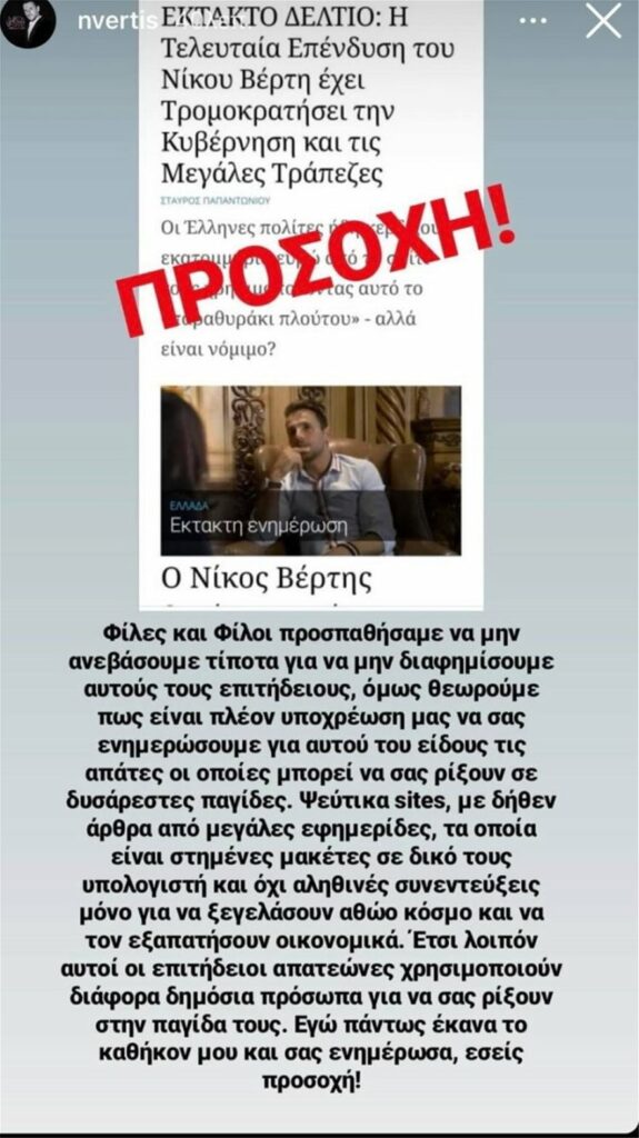 Με ένα μήνυμα στον προσωπικό του λογαριασμό στο instagram, ο Νίκος Βέρτης θέλησε να ενημερώσει τους followers του για τη διαδικτυακή απάτη και το ψευδές δημοσίευμα που τον παρουσιάζει να έχει κάνει μια τελευταία επένδυση η οποία τρομοκρατεί την κυβέρνηση και τις τράπεζες.