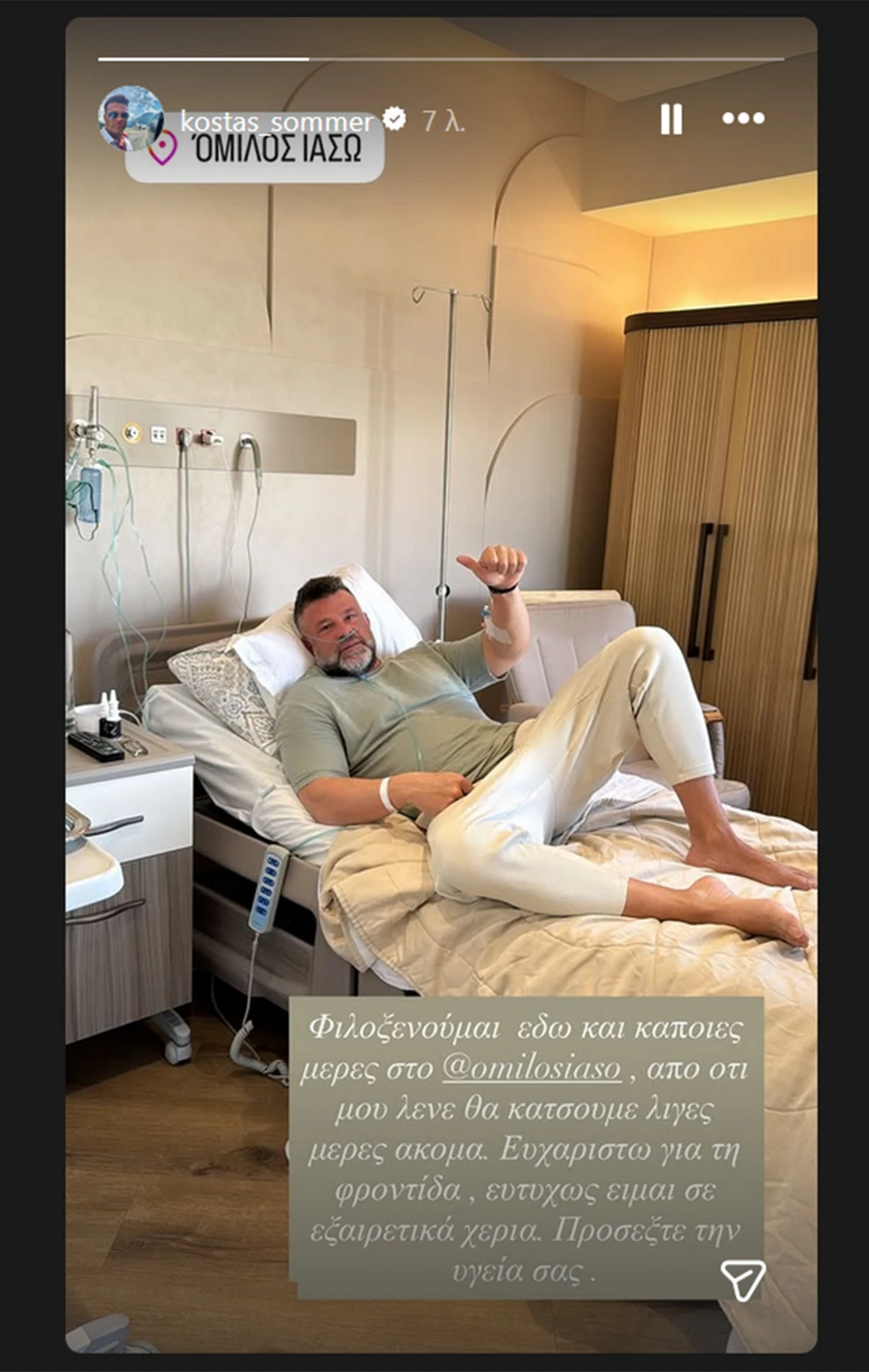 Ανησυχία προκάλεσε στους διαδικτυακούς του φίλους ο Κώστας Σόμμερ, καθώς το μεσημέρι της Δευτέρας (2/2) δημοσίευσε μια φωτογραφία που τον δείχνει να νοσηλεύεται σε ιδιωτικό θεραπευτήριο. Ο γνωστός ηθοποιός και επιχειρηματίας επέλεξε να μοιραστεί το γεγονός μέσα από το προφίλ του στο Instagram, στέλνοντας παράλληλα ένα μήνυμα στους ακολούθους του.