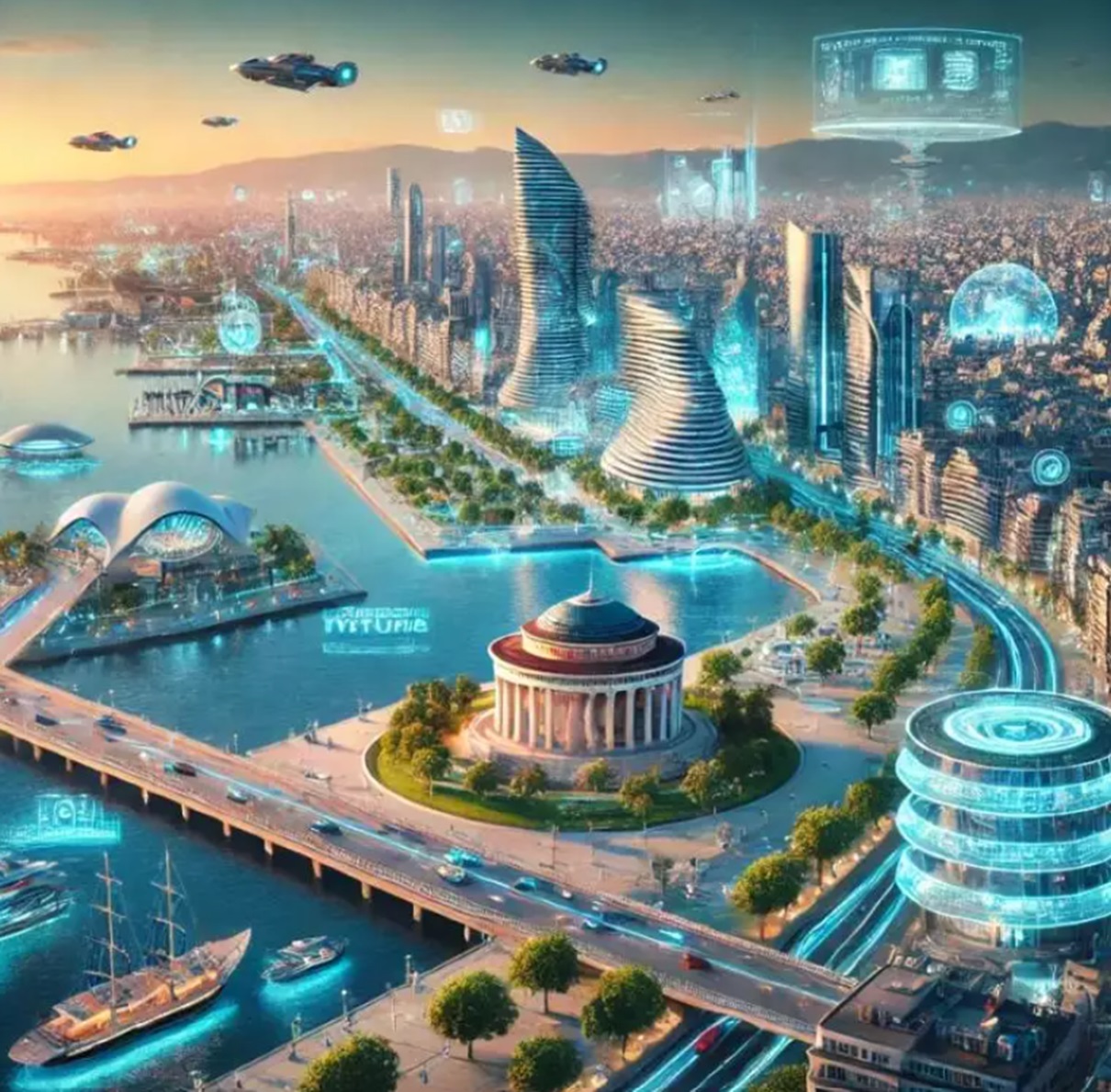 Παράλληλα, «οι φουτουριστικές μεταφορές, δηλαδή προηγμένα μέσα μεταφοράς, όπως ιπτάμενα αυτοκίνητα και τρένα που πιθανώς αιωρούνται πάνω από το έδαφος, υποδεικνύοντας ένα σύστημα μεταφορών υψηλής ταχύτητας και χαμηλών εκπομπών. Και η ψηφιακή τεχνολογία και τα ολογράμματα, δηλαδή όπως φαίνονται στην εικόνα διάφορα ψηφιακά και ολογραφικά στοιχεία. Αυτό υποδηλώνει ότι οι πληροφορίες και οι υπηρεσίες είναι πιθανώς ενσωματωμένες στο αστικό τοπίο μέσω προηγμένων οθονών και ολογραφικών σημείων πληροφόρησης», εξηγεί το ChatGPT αναφορικά με τα χαρακτηριστικά της πόλης σε 100 χρόνια από σήμερα.