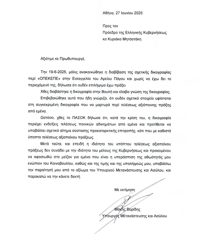 Ανακοινώνεται ότι ο Υπουργός Μετανάστευσης και Ασύλου Μάκης Βορίδης υπέβαλε την παραίτησή του στον Πρωθυπουργό, για τους λόγους που αναφέρονται στην επιστολή και η οποία επισυνάπτεται. Ο Πρωθυπουργός έκανε δεκτή την παραίτησή του.