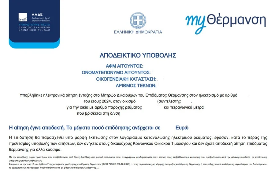 Τονίζεται ότι όσοι έχουν κάνει αίτηση μέσα από το myΘερμανση της ΑΑΔΕ μπορούν να δουν το ποσό που δικαιούνται.