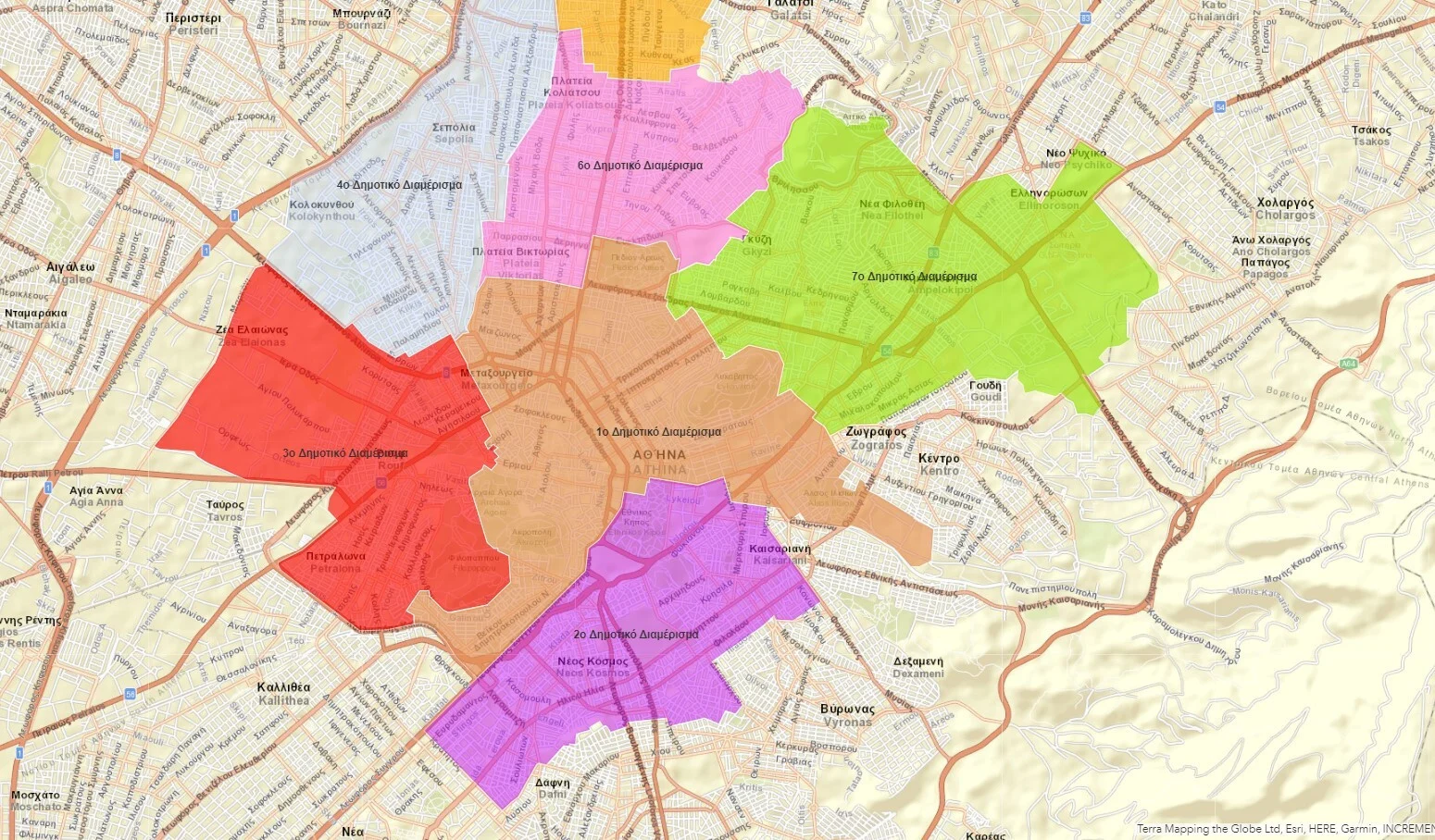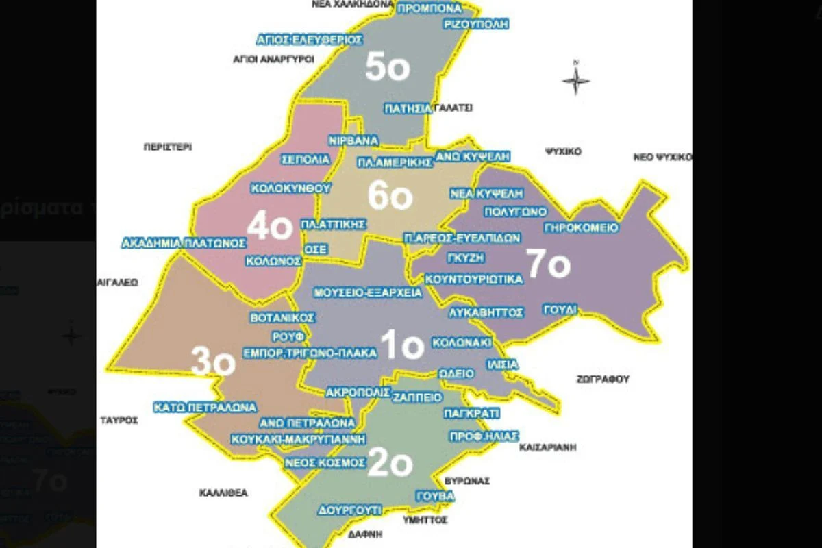 Αρχικά να πούμε πως ο Δήμος Αθηναίων χωρίζεται σήμερα διοικητικά σε επτά διαμερίσματα τα οποία αριθμούνται σε 1ο, 2ο, 3ο, 4ο, 5ο, 6ο και 7ο.