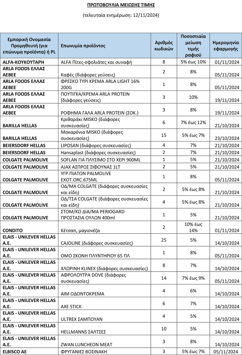 Σημειώνεται ότι στη νέα λίστα, συμπεριλαμβάνεται η ημερομηνία έναρξης εφαρμογής της μειωμένης τιμής, διευκολύνοντας έτσι τους καταναλωτές στις επιλογές τους.