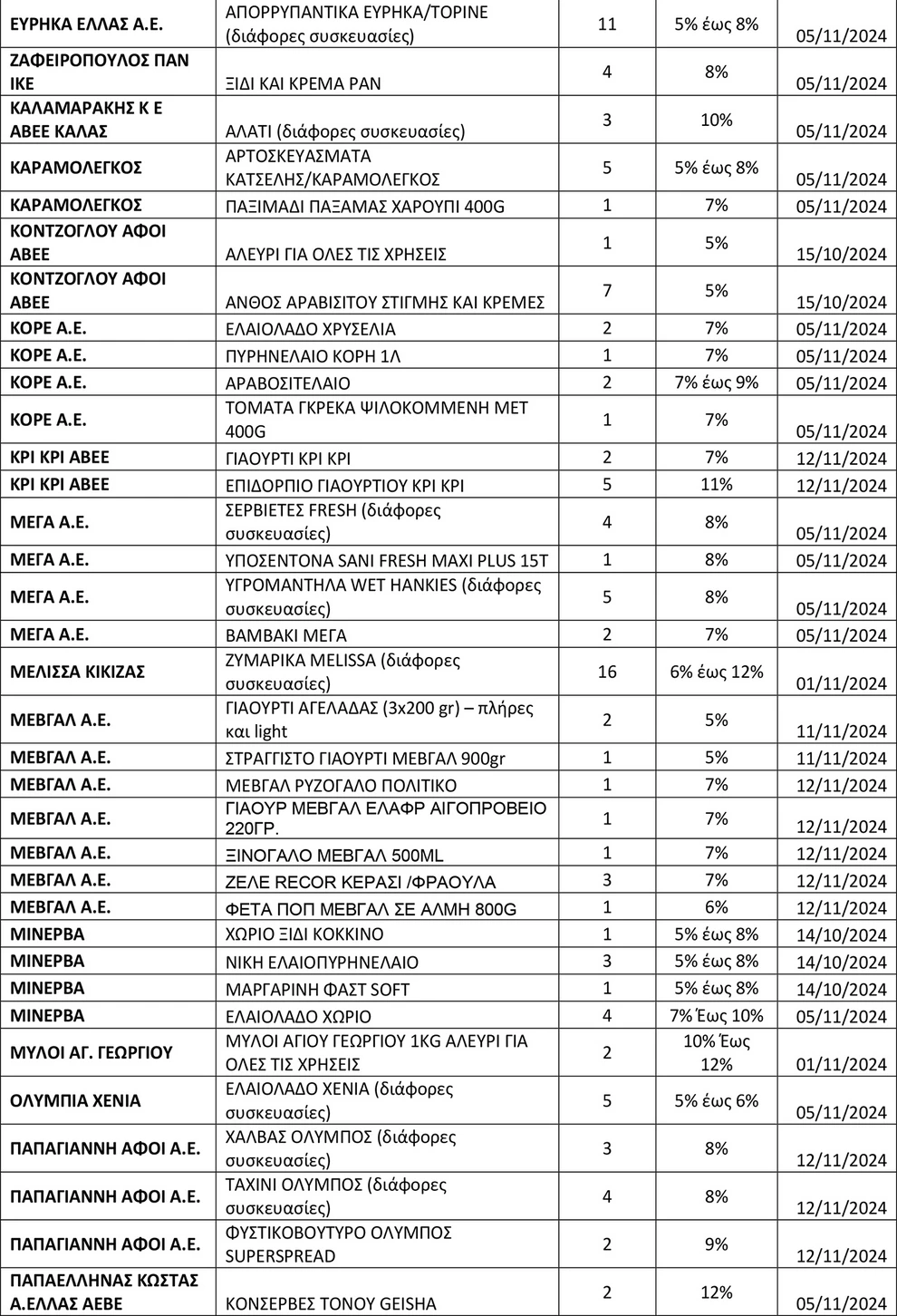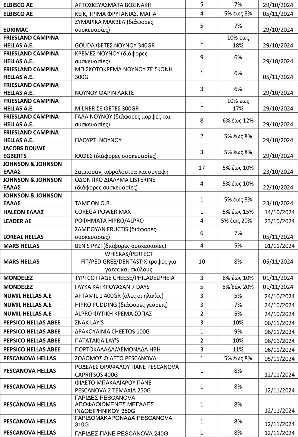 Μεταξύ των προϊόντων στα οποία μειώνονται οι τιμές βρίσκονται τα κατεψυγμένα θαλασσινά, γαλακτοκομικά προϊόντα και σοκολάτες και πολλά άλλα.