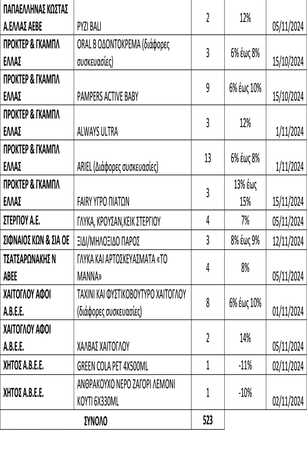 Την ανανεωμένη λίστα με τους 523 κωδικούς προϊόντων που έχουν ενταχθεί έως τώρα στην πρωτοβουλία μείωσης τιμών στα σούπερ μάρκετ από 5% έως 24%, ανακοίνωσε σήμερα (13/11) το υπουργείο Ανάπτυξης.