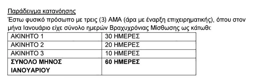 Έστω φυσικό πρόσωπο με τρεις (3) ΑΜΑ (άρα με έναρξη επιχειρηματικής), όπου στον μήνα Ιανουάριο είχε σύνολο ημερών Βραχυχρόνιας Μίσθωσης ως κάτωθι: