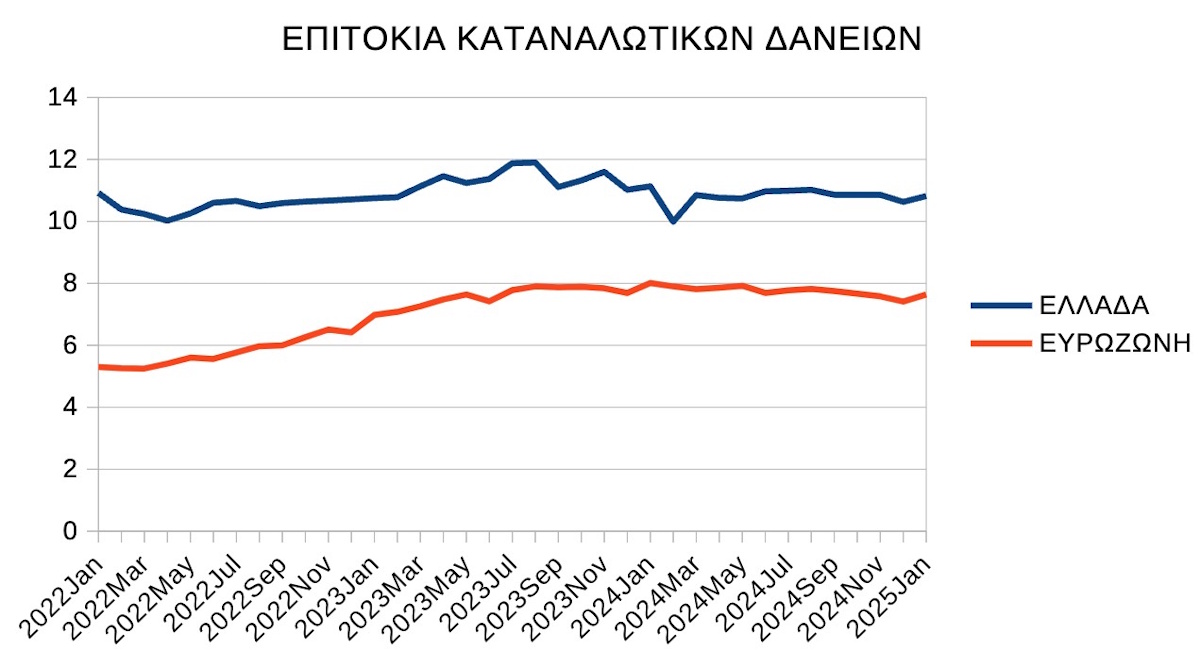 Αύξηση επιτοκίων έκαναν οι ελληνικές τράπεζες και στα καταναλωτικά δάνεια, όπου το μέσο επιτόκιο τον Ιανουάριο του 2025 ανέβηκε στο 10,82%, από 10,63% τον Δεκέμβριο του 2024. Το ίδιο επιτόκιο αυξήθηκε και στην Ευρωζώνη και ανέβηκε τον Ιανουάριο στο 7,64% από 7,41% το Δεκέμβριο.