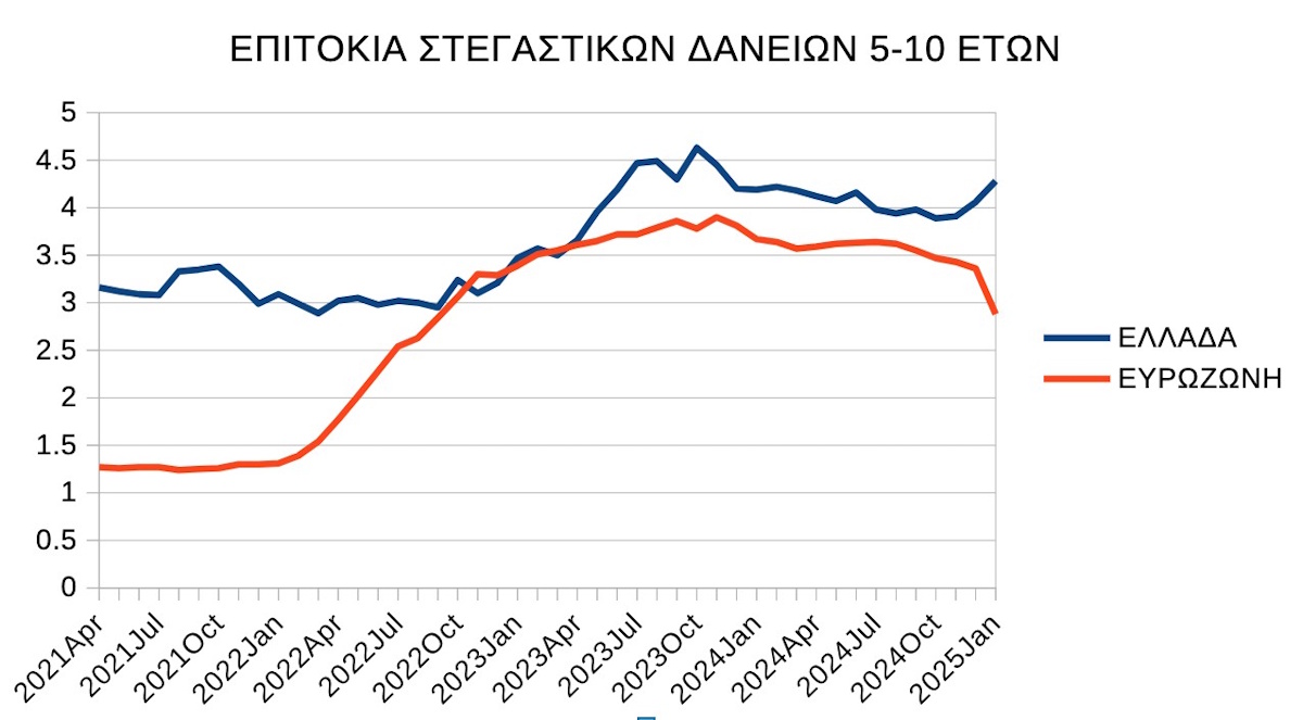 Στα στεγαστικά δάνεια μεγαλύτερης διάρκειας, άνω των 10 ετών, το επιτόκιο αυξήθηκε στο 3,9% τον Ιανουάριο του 2025, από 3,8% που ήταν τον Δεκέμβριο, ενώ, αντιθέτως, στην Ευρωζώνη μειώθηκε και άλλο και έφτασε στο 2,97% από 3,09%.