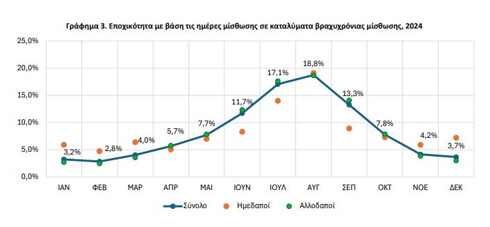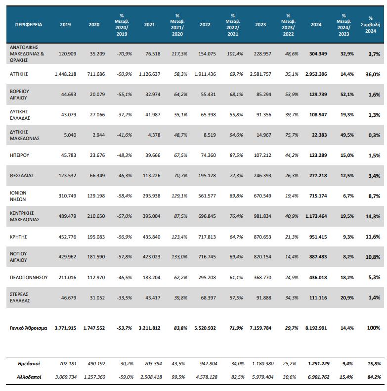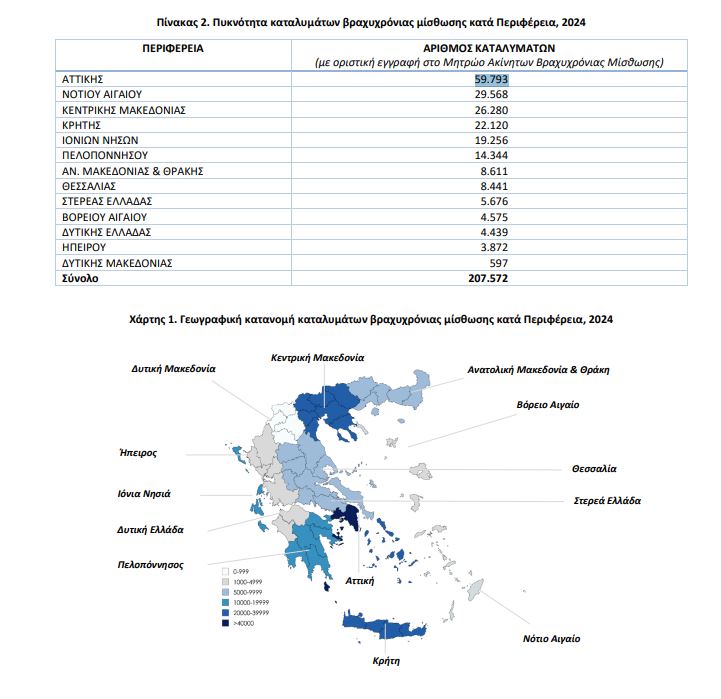 Σε ό,τι αφορά τις ημέρες μίσθωσης, ο μεγαλύτερος αριθμός για το 2024 σε σύγκριση με το 2023 σε απόλυτα μεγέθη καταγράφηκε στις Περιφέρειες Αττικής με 2,9 εκατ. και μεταβολή 14,4%, Κεντρικής Μακεδονίας με 1,17 εκατ. και άνοδο 19,5% και Κρήτης με 951 χιλιάδες ημέρες και αύξηση 9,3%.
