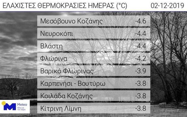 Όπως φαίνεται η ελάχιστη θερμοκρασία της ημέρας σημειώθηκε στο Μέσοβουνο Κοζάνης και ήταν ίση με -4.6 βαθμούς Κελσίου και ακολούθησαν το Νευροκόπι Δράμας και η Βλάστη Κοζάνης με -4.4 βαθμούς Κελσίου.