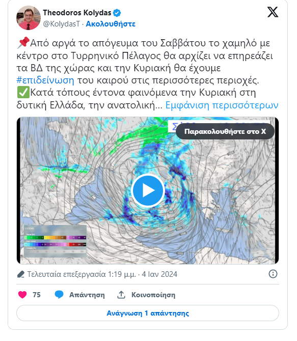 «Από αργά το απόγευμα του Σαββάτου το χαμηλό με κέντρο στο Τυρρηνικό Πέλαγος θα αρχίζει να επηρεάζει τα ΒΔ της χώρας και την Κυριακή θα έχουμε #επιδείνωση του καιρού στις περισσότερες περιοχές. Κατά τόπους έντονα φαινόμενα στη δυτική Ελλάδα, την ανατολική Μακεδονία, τη Θράκη, τα νησιά του ανατολικού Αιγαίου και τα Δωδεκάνησα. Άνεμοι την Κυριακή ΝΔ 5 με 7, στα πελάγη τοπικά 8 και στο ανατολικό Αιγαίο πιθανώς έως 9 μποφόρ, με μικρή εξασθένηση από το απόγευμα».
