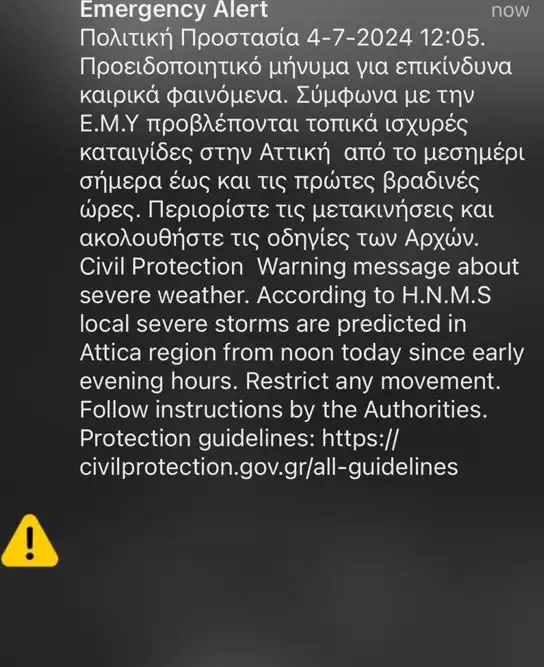 «Σύμφωνα με την ΕΜΥ προβλέπονται τοπικά ισχυρές καταιγίδες στην Αττική από το μεσημέρι σήμερα έως και τις πρώτες βραδινές ώρες. Πειορίστε τις μετακινήσεις και ακολουθήστε τις οδηγίες των Αρχών», αναφέρεται στο μήνυμα του 112.