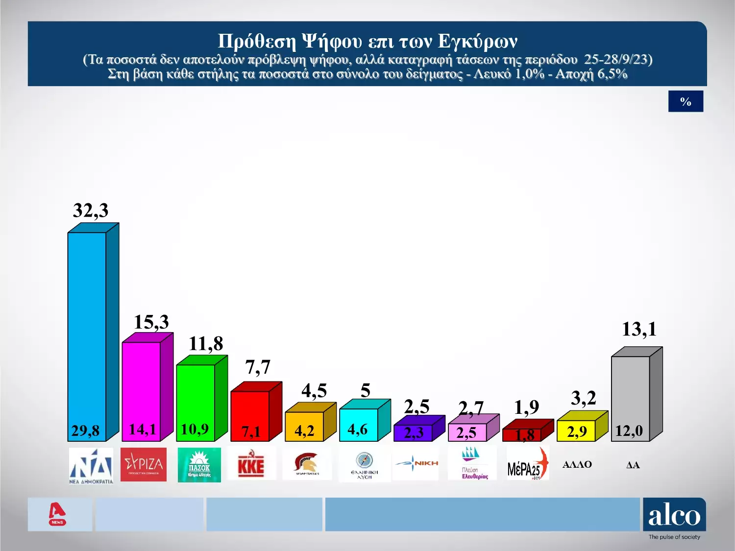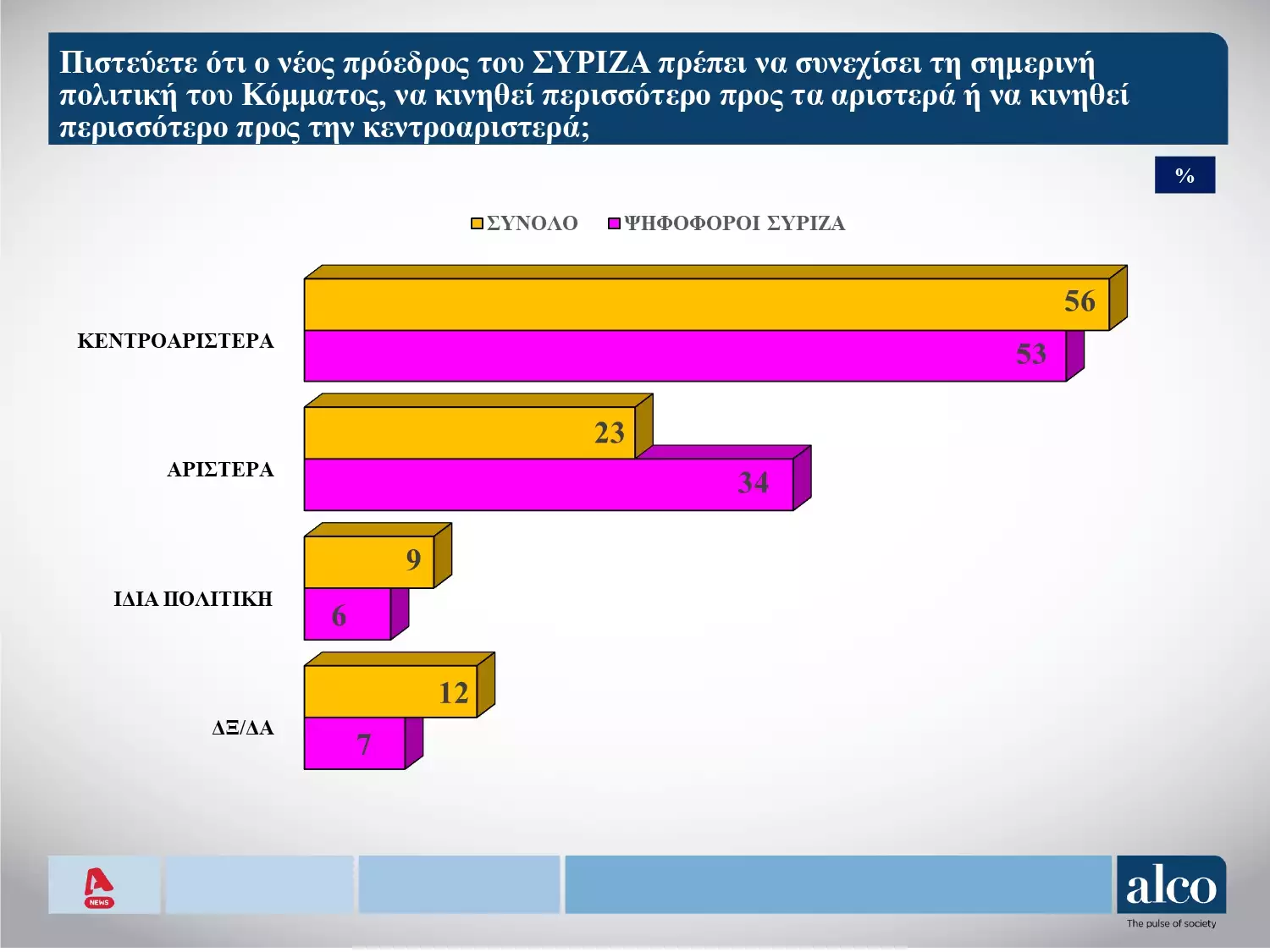 Πάντως η Νέα Δημοκρατία κρατάει μια διαφορά 17 μονάδων από τον ΣΥΡΙΖΑ σύμφωνα πάντα με την δημοσκόπηση της Alco ενώ οι πολίτες ζητούν από τον Στέφανο Κασσελάκη να στραφεί προς το κέντρο.