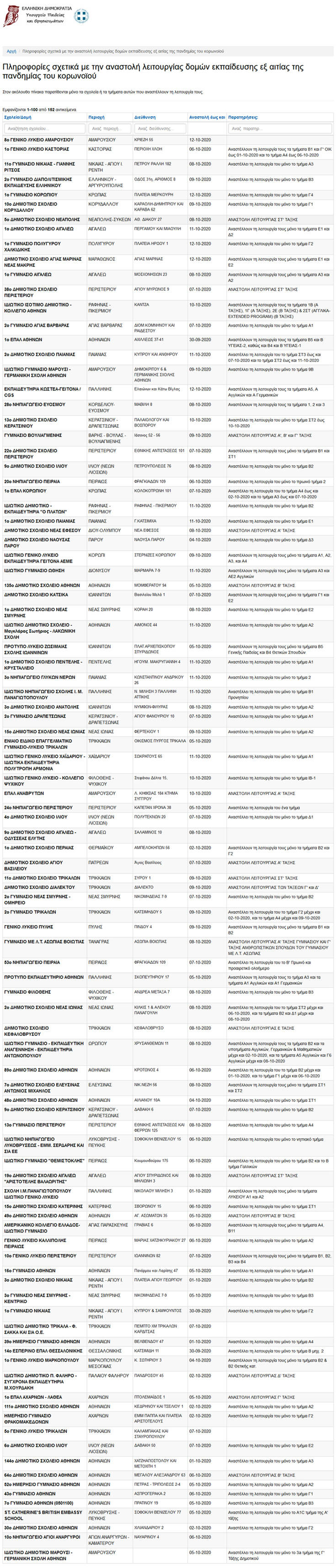 Η λίστα του υπουργείου Παιδείας αριθμεί σήμερα 152 σχολικές μονάδες που έχουν κλείσει λόγω κορονοϊού, στην πλειοψηφία τους συγκεκριμένα τμήματα και όχι ολόκληρες σχολικές μονάδες. Τα περισσότερα σχολεία θα μείνουν κλειστά μέχρι το πρώτο δεκαήμερο του Οκτωβρίου.
