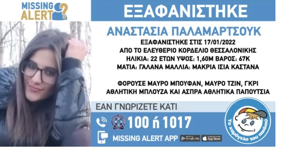 «Στις 17 Ιανουαρίου 2022, πρωινές ώρες, εξαφανίστηκε από την περιοχή του Ελευθέριου Κορδελιού Θεσσαλονίκης, η Αναστασία Παλαμαρτσούκ, 22 ετών. Το «Χαμόγελο του Παιδιού» ενημερώθηκε για την εξαφάνιση της Αναστασίας Παλαμαρτσούκ, σήμερα στις 19/1/2022 και προχώρησε στη δημοσιοποίηση των στοιχείων της ενήλικης κατόπιν αιτήματος της οικογένειάς της, καθώς ενδέχεται να συντρέχουν λόγοι, οι οποίοι θέτουν τη ζωή της σε κίνδυνο.