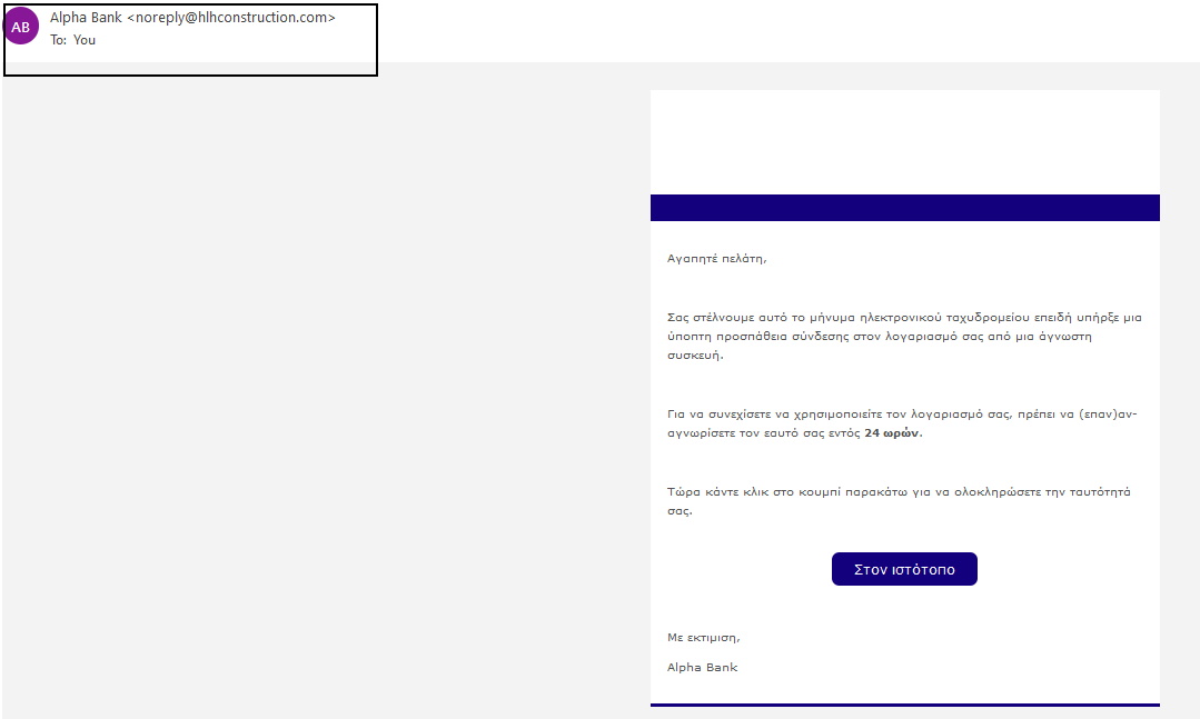Το email που θα δείτε, έχει σταλεί δήθεν από την Alpha Bank και καλεί τους χρήστες να κάνουν διαδικτυακή ταυτοποίηση του λογαριασμού τους. Αν κάποιος πατήσει στο ειδικό κουμπί, θα μεταφερθεί σε άλλο ιστότοπο όπου θα πρέπει να εισάγει τα στοιχεία του. Φυσικά αν σας έρθει ένα τέτοιο email, σε καμία περίπτωση δεν πρέπει να εισάγετε οποιαδήποτε στοιχεία σας.