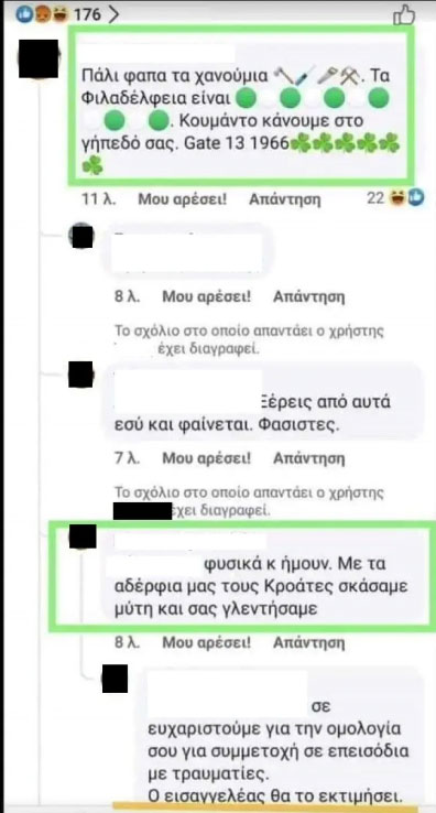 Δεν γνωρίζω, αν είναι Κροάτες στη φωτογραφία που μου επιδεικνύετε. Στη φωτογραφία που μου επιδεικνύετε αυτοί σίγουρα δεν είναι Κροάτες και δεν αναγνωρίζω κανέναν. Η ομάδα που φαίνεται στη δεύτερη φωτογραφία θα μπορούσε να είναι αυτή που κάνει την επίθεση εναντίον μας. Επιτέθηκαν σε εμάς, που πήγαμε στην προπόνηση. Δεν ξέρω ποιοι ήταν. Εμείς ήμασταν μόνο Κροάτες και δεν υπάρχει ανάμεσα μας Έλληνας».
