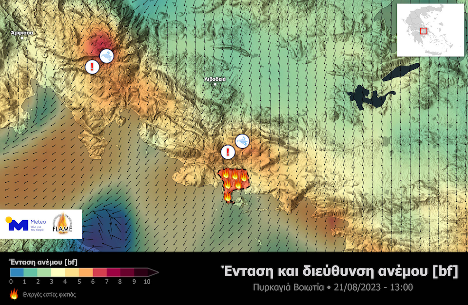 Εικόνα 2. Προγνωστικός χάρτης ανέμου (ένταση και διεύθυνση) για την περιοχή της Βοιωτίας για τη Δευτέρα 21 Αυγούστου 2023.
