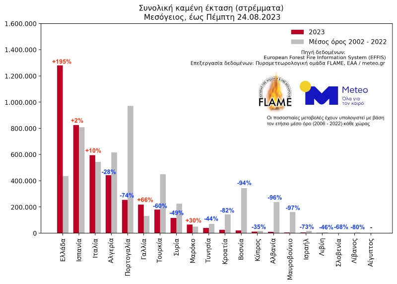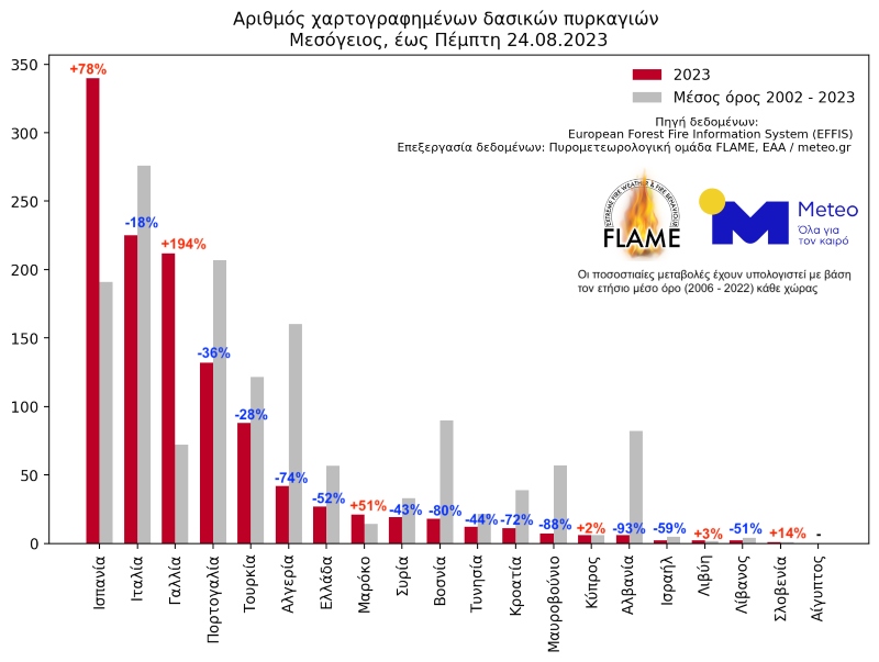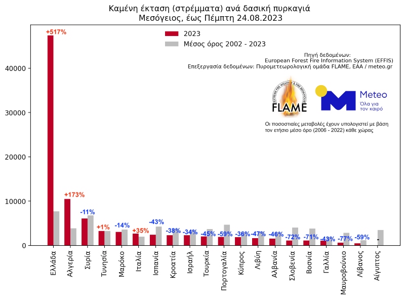 Καταγράφοντας 281.480 στρέμματα καμένων εκτάσεων έως την Πέμπτη 24.08.2023, η Ελλάδα κατατάσσεται πρώτη μεταξύ 20 Μεσογειακών χωρών. Δεύτερη έρχεται η Ισπανία με 824.640 στρέμματα και τρίτη η Ιταλία με 595.330 στρέμματα. Αύξηση των καμένων εκτάσεων καταγράφουν επίσης η Γαλλία (+66%) και το Μαρόκο (+30%), ενώ μείωση καταγράφεται στις υπόλοιπες χώρες.