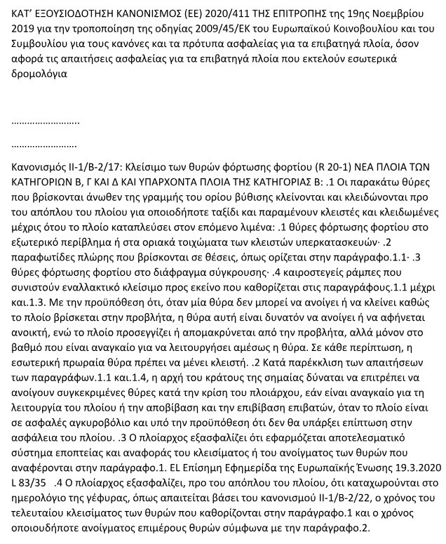 Ο Κανονισμός 2020/411 της επιτροπής της 19ης Νοεμβρίου 2019 για την τροποποίηση της οδηγίας 2009/45/ΕΚ του Ευρωπαϊκού Κοινοβουλίου και του Συμβουλίου για τους κανόνες και τα πρότυπα ασφαλείας για τα επιβατηγά πλοία, όσον αφορά τις απαιτήσεις ασφαλείας για τα επιβατηγά πλοία που εκτελούν εσωτερικά δρομολόγια, προβλέπει μεταξύ άλλων το εξής: