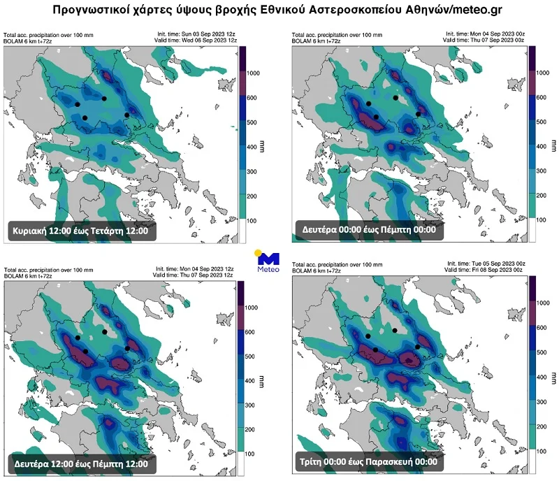 Οι χάρτες που παρουσιάζονται δείχνουν το συνολικό προβλεπόμενο ύψος βροχής σε χιλιοστά με χρονικό ορίζοντα 72 ωρών από τις 4 αρχικοποιήσεις του αριθμητικού μοντέλου πρόγνωσης καιρού του Εθνικού Αστεροσκοπείου Αθηνών/meteo.gr μεταξύ Κυριακής 3 και Τρίτης 5 Σεπτεμβρίου 2023.