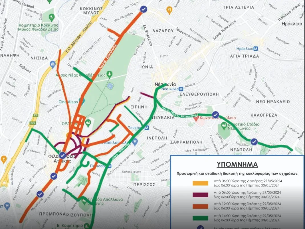 Ήδη, στην περιοχή της Νέας Φιλαδέλφειας, στις οδούς Καππαδοκίας, Πατριάρχου Κωνσταντίνου και Χρυσοστόμου Σμύρνης, εφαρμόζονται ρυθμίσεις με –κατά περίπτωση- προσωρινή και σταδιακή διακοπή της κυκλοφορίας και απαγόρευση στάσης και στάθμευσης.
