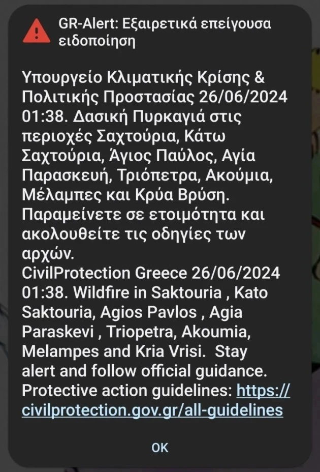 Λίγο πριν από τις 02:00 το πρωί εστάλη μήνυμα από το «112» στους κατοίκους των περιοχών Σαχτούρια, Κάτω Σαχτούρια, Άγιος Πεύλος, Αγία Παρασκευή, Τριόπετρα, Ακούμια, Μέλαμπες και Κρύα Βρύση να παραμείνουν σε ετοιμότητα και να ακολουθήσουν τις οδηγίες των Αρχών.
