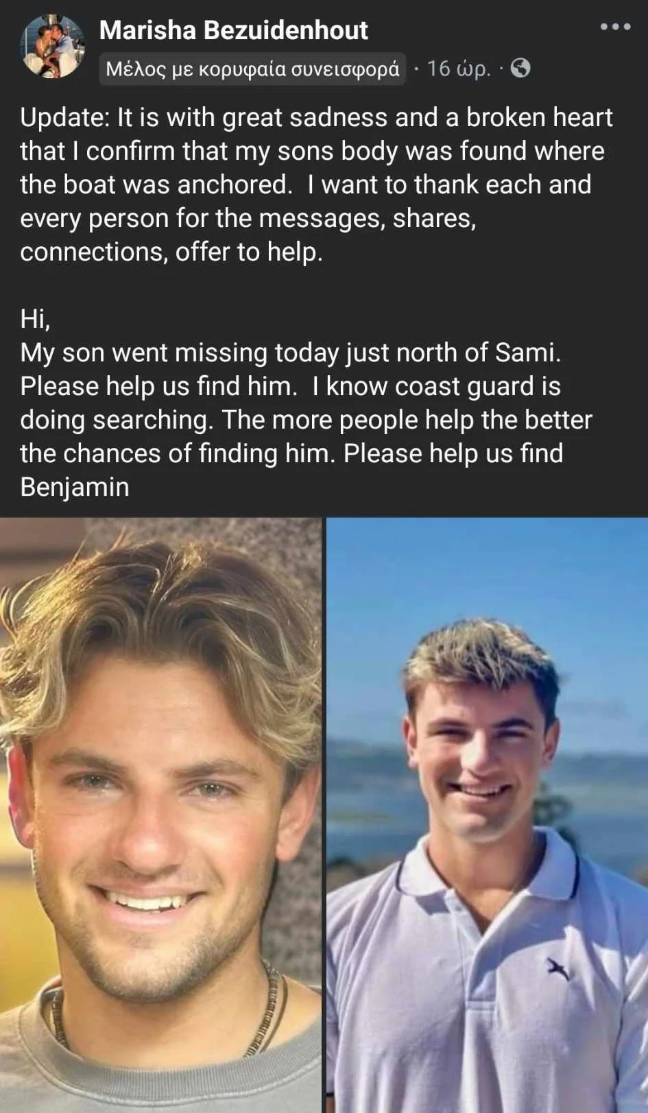 Η μητέρα του 20χρονου, μετά τη γνωστοποίηση της είδησης, ανέβασε μια συγκινητική ανάρτηση στην οποία γράφει ότι, «με μεγάλη θλίψη και ραγισμένη καρδιά επιβεβαιώνω ότι το σώμα του γιου μου βρέθηκε εκεί όπου ήταν αγκυροβολημένο το σκάφος. Θέλω να ευχαριστήσω κάθε άτομο για τα μηνύματα, τις κοινοποιήσεις, τις συνδέσεις, την προσφορά βοήθειας».