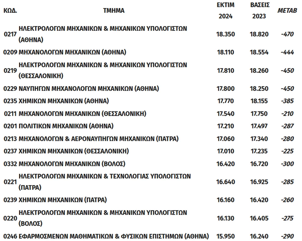Ειδικά, το τμήμα των Ηλεκτρολόγων μηχανικών αναμένεται να έχει πτώση σχεδόν 500 μορίων.