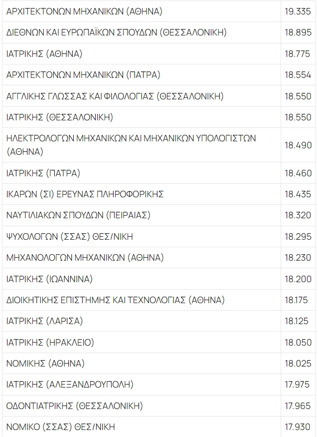Πιο αναλυτικά, τα τμήματα με τις υψηλότερες βάσεις εισαγωγής είναι τα εξής: