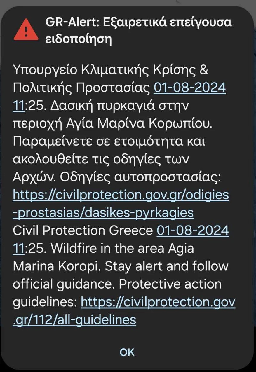 «Δασική πυρκαγιά στην περιοχή Αγία Μαρίνα Κορωπίου. Παραμείνετε σε ετοιμότητα και ακολουθείτε τις οδηγίες των αρχών» αναφέρει το μήνυμα του 112.