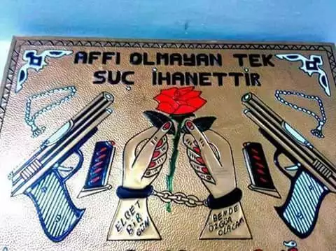 «Το μόνο έγκλημα για το οποίο δεν υπάρχει συγχώρεση είναι η προδοσία» αναφέρεται στα τουρκικά σε μια εικόνα που ανέβασε στο Facebook με δύο πιστόλια και δύο γυναικεία χέρια που κρατούν ένα τριαντάφυλλο.