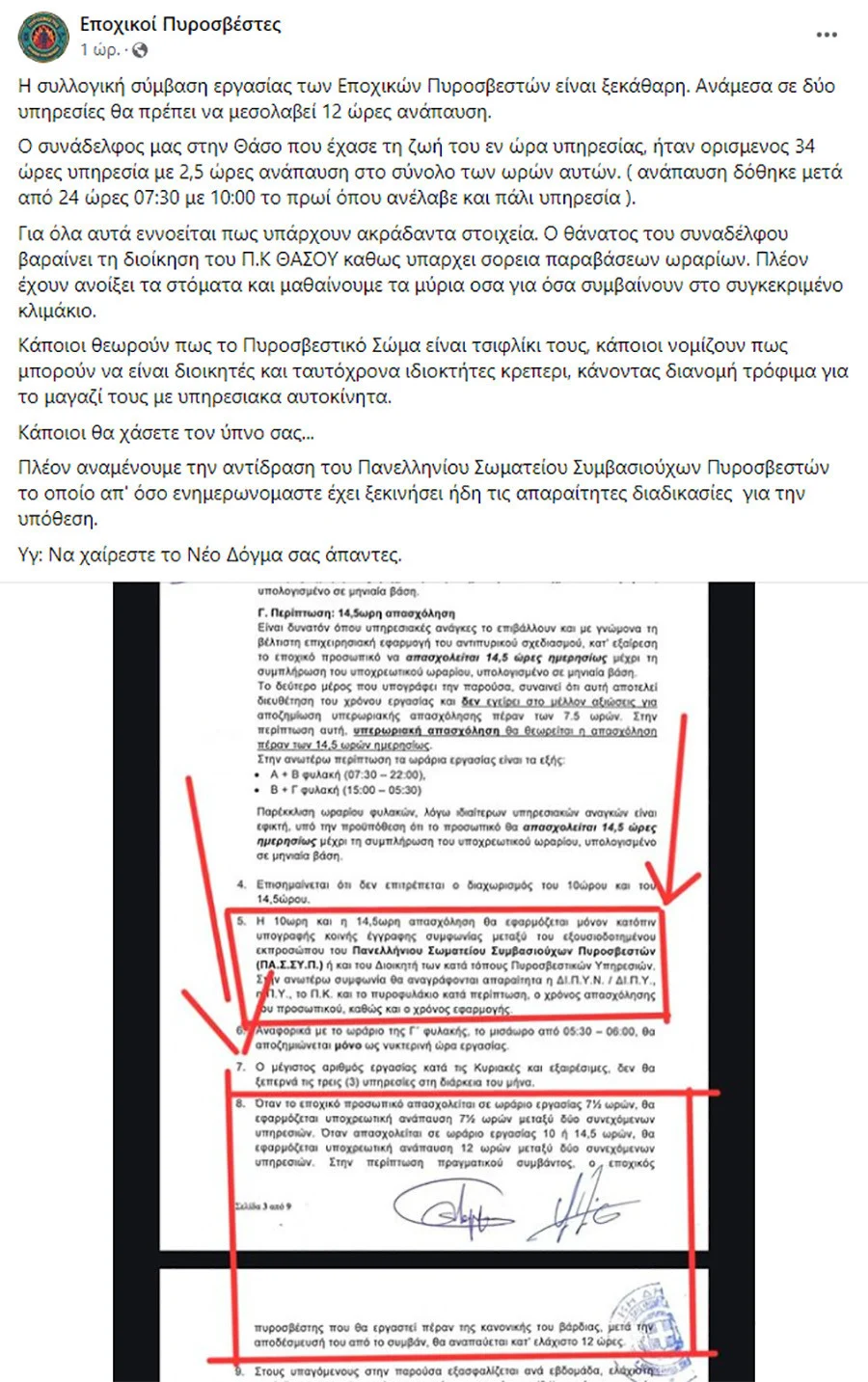 Ο συνάδελφος μας στη Θάσο, που έχασε τη ζωή του εν ώρα υπηρεσίας, ήταν ορισμένος 34 ώρες υπηρεσία με 2,5 ώρες ανάπαυση στο σύνολο των ωρών αυτών (ανάπαυση δόθηκε μετά από 24 ώρες 07:30 με 10:00 το πρωί όπου ανέλαβε και πάλι υπηρεσία)».