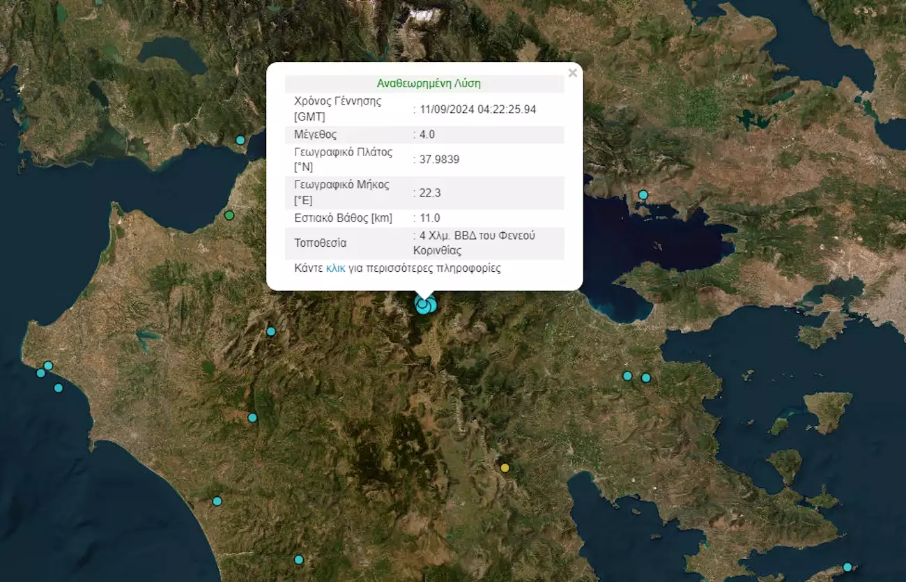 Ισχυρός σεισμός των 4 Ρίχτερ σημειώθηκε το πρωί της Τετάρτης (11.09.2024) στο Φενεό Κορινθίας.
