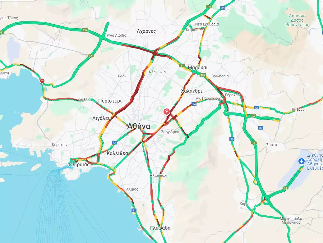Οι περισσότεροι δρόμοι της Αθήνας αυτή τη στιγμή βρίσκονται στο «κόκκινο». Σοβαρά προβλήματα από την κίνηση στους δρόμους εμφανίζονται σε Κηφισό, Κηφισίας, Μεσογείων, Αττική οδό, κέντρο Αθήνας και Πειραιά.