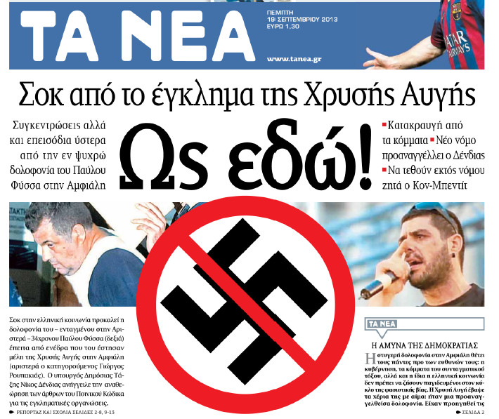 «Σοκ στην ελληνική κοινωνία προκαλεί η στυγερή δολοφονία του – ενταγμένου στην Αριστερά – 34χρονου Παύλου Φύσσα από τον 45χρονο χρυσαυγίτη Γιώργο Ρουπακιά. Η δολοφονία με μαχαίρι – σε ενέδρα που έστησαν μέλη της Χρυσής Αυγής έξω από καφενείο, στην Αμφιάλη – ήταν το επιστέγασμα της φασιστικής βίας από στελέχη της οργάνωσης όλες τις προηγούμενες ημέρες.