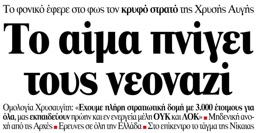 Την επομένη της δολοφονίας «ΤΑ ΝΕΑ» περιγράφουν πώς τα μέλη της Χρυσής Αυγής έστησαν ενέδρα θανάτου στον 34χρονο Παύλο Φύσσα.