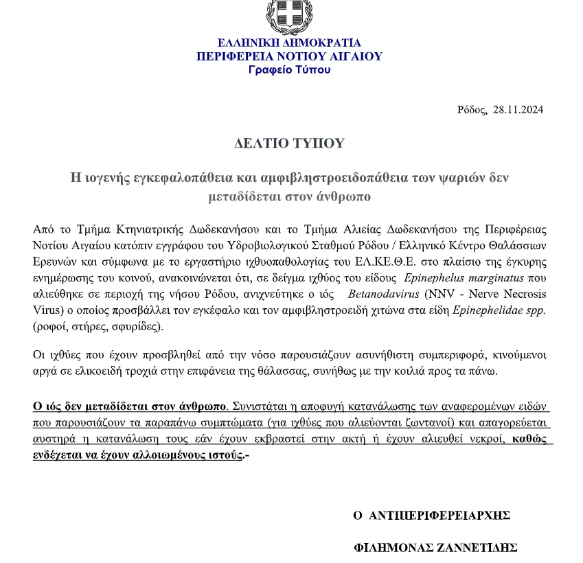 Ειδικότερα σύμφωνα με το kalymnos-news.gr το Τμήμα Κτηνιατρικής Δωδεκανήσου και το Τμήμα Αλιείας Δωδεκανήσου της Περιφέρειας Νοτίου Αιγαίου κατόπιν εγγράφου του Υδροβιολογικού Σταθμού Ρόδου / Ελληνικό Κέντρο Θαλάσσιων Ερευνών και σύμφωνα με το εργαστήριο ιχθυοπαθολογίας του ΕΛ.ΚΕ.Θ.Ε. στο πλαίσιο της έγκυρης ενημέρωσης του κοινού, ανακοινώνεται ότι, σε δείγμα ιχθύος του είδους Epinephelus marginatus που αλιεύθηκε σε περιοχή της νήσου Ρόδου, ανιχνεύτηκε ο ιός Betanodavirus (ΝΝV – Nerve Necrosis Virus) ο οποίος προσβάλλει τον εγκέφαλο και τον αμφιβληστροειδή χιτώνα στα είδη Epinephelidae spp. (ροφοί, στήρες, σφυρίδες).
