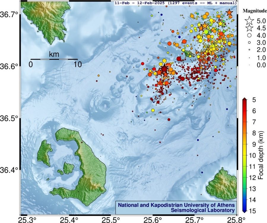 Από την αρχή της σεισμικής δραστηριότητας στη ζώνη Σαντορίνης – Αμοργού στις 26 Ιανουαρίου έως και τις 11 Φεβρουαρίου 2025, το Εργαστήριο Σεισμολογίας του ΕΚΠΑ (http://dggsl.geol.uoa.gr/) έχει ανιχνεύσει και εντοπίσει, με αυστηρά κριτήρια για τη διασφάλιση της ποιότητας των αποτελεσμάτων, συνολικά πάνω από 16.500 σεισμούς με μεθόδους μηχανικής μάθησης (τεχνητής νοημοσύνης), εκ των οποίων άνω των 14.400 με μεγέθη Μ³1.0.