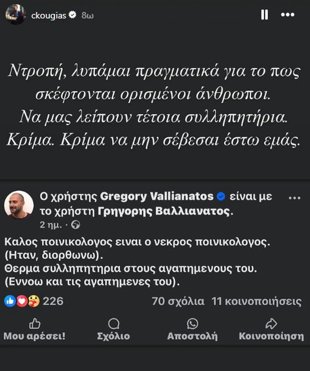 Ειδικότερα, ο Γρηγόρης Βαλλιανάτος έγραψε στον λογαριασμό του στο facebook: «Ευχαριστώ για τη δωρεάν διαφήμιση, όσους δεν με έμαθαν σαράντα χρόνια τώρα. Πληκτρολογήστε τα δυο ονόματά μας (google, youtube) και θα δείτε αναρτημένα βίντεο με αυτά που ανταλλάξαμε τα τελευταία είκοσι χρόνια. Δημόσια και δυνατά. Με τους συγγενείς των νεκρών, όπως θυμηθήκαμε με τα Τέμπη, (εκτός από την ΝΔ που άργησε πολύ να το καταλάβει), δεν αντιδικούμε. Μετά τα εννιάμερα τα ξαναλέμε».